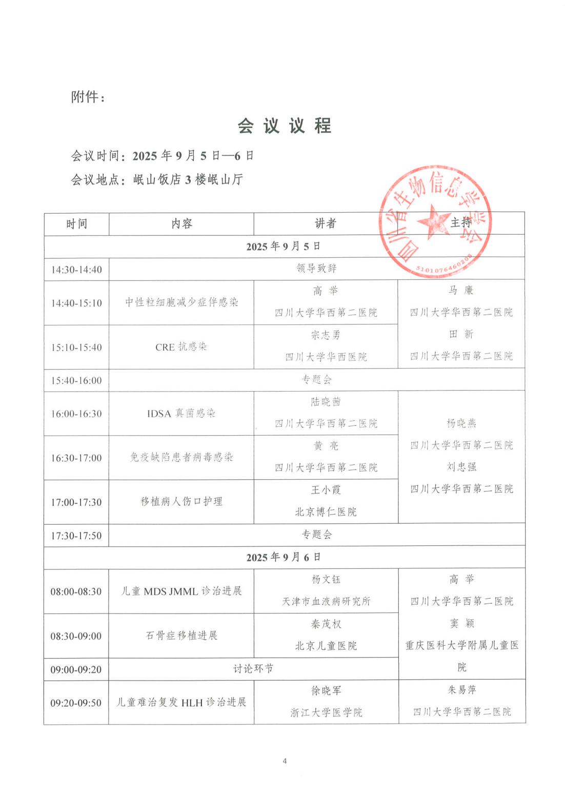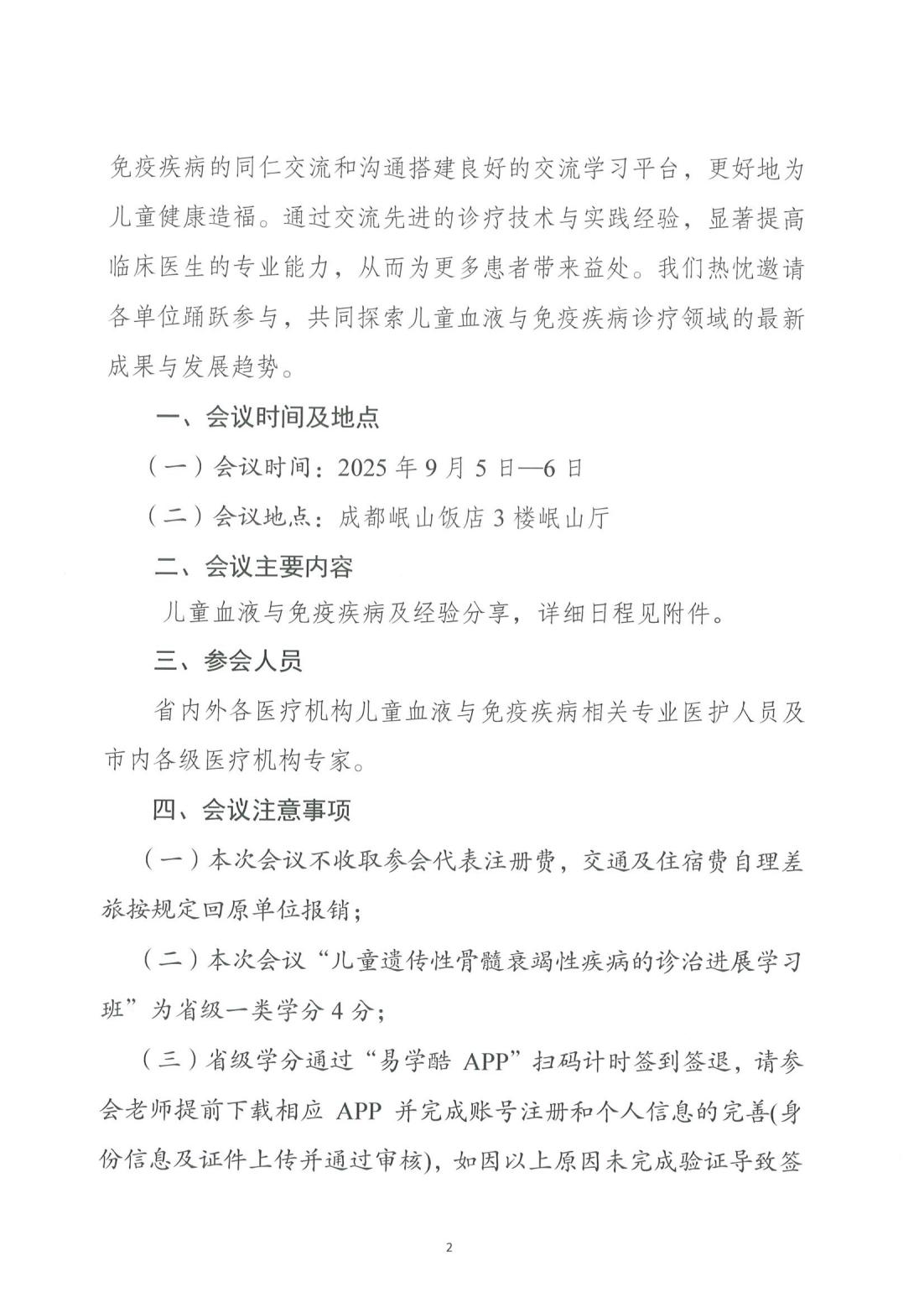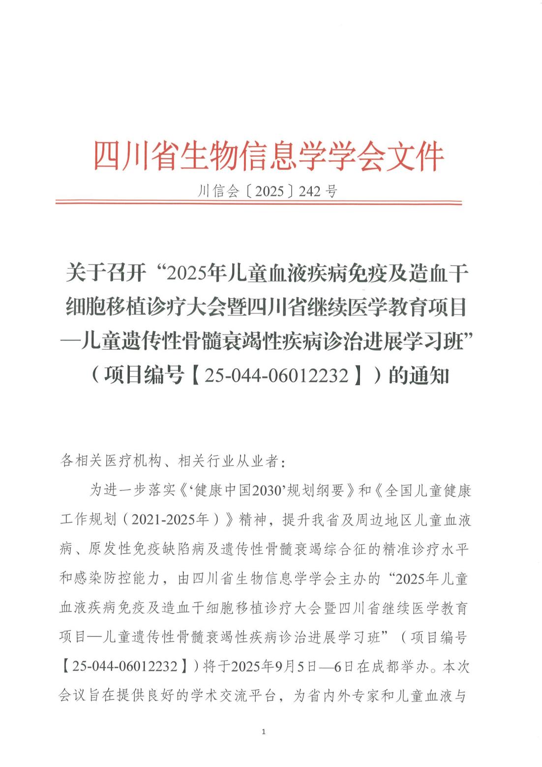 【会议通知】关于召开“2025年儿童血液疾病免疫及造血干细胞移植诊疗大会暨四川省继续医学教育项目—儿童遗传性骨髓衰竭性疾病诊治进展学习班”(项目编号【25-044-06012232】)的通知