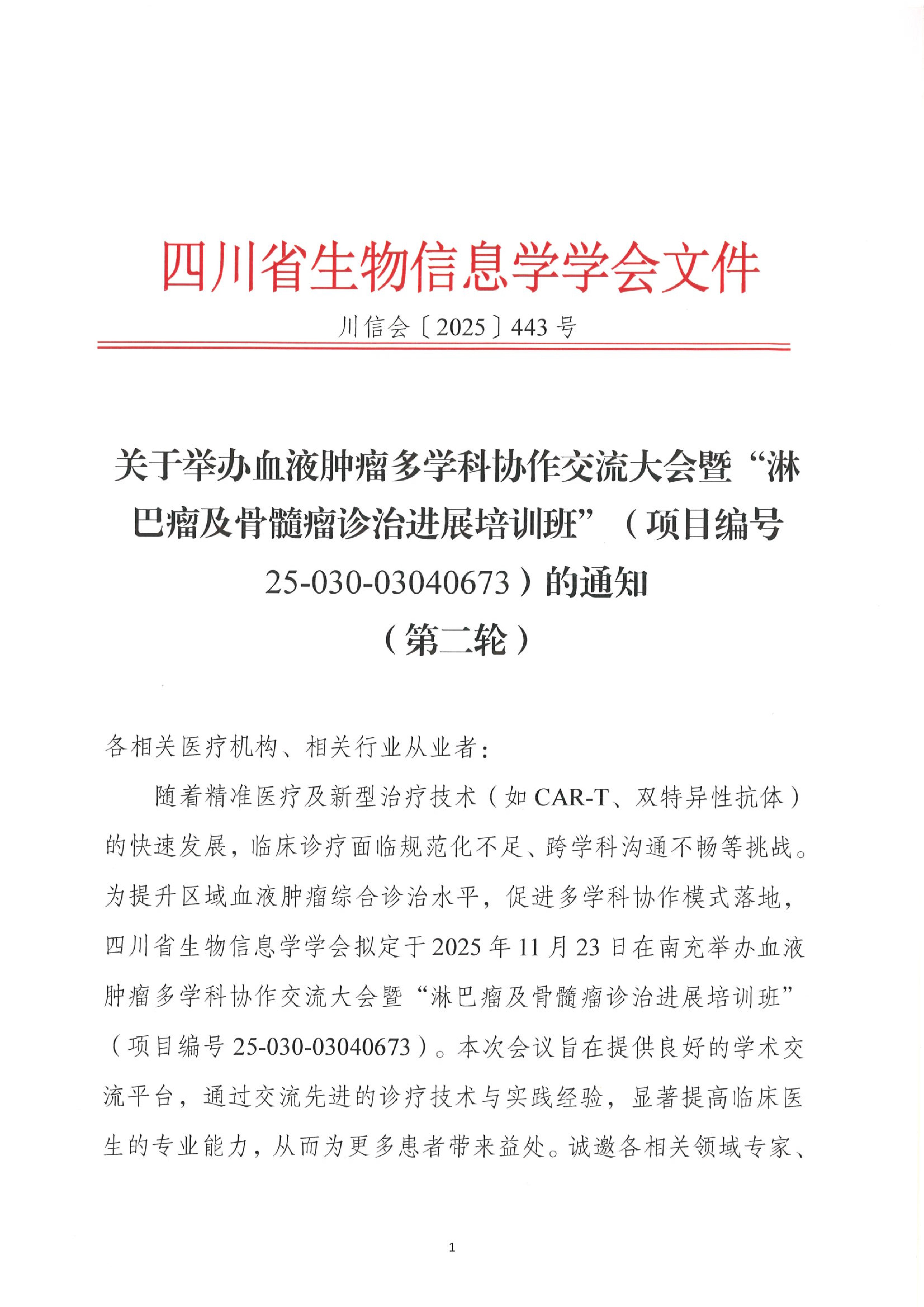 【会议通知】关于举办血液肿瘤多学科协作交流大会暨“淋巴瘤及骨髓瘤诊治进展培训班”(项目编号25-030-03040673)的通知