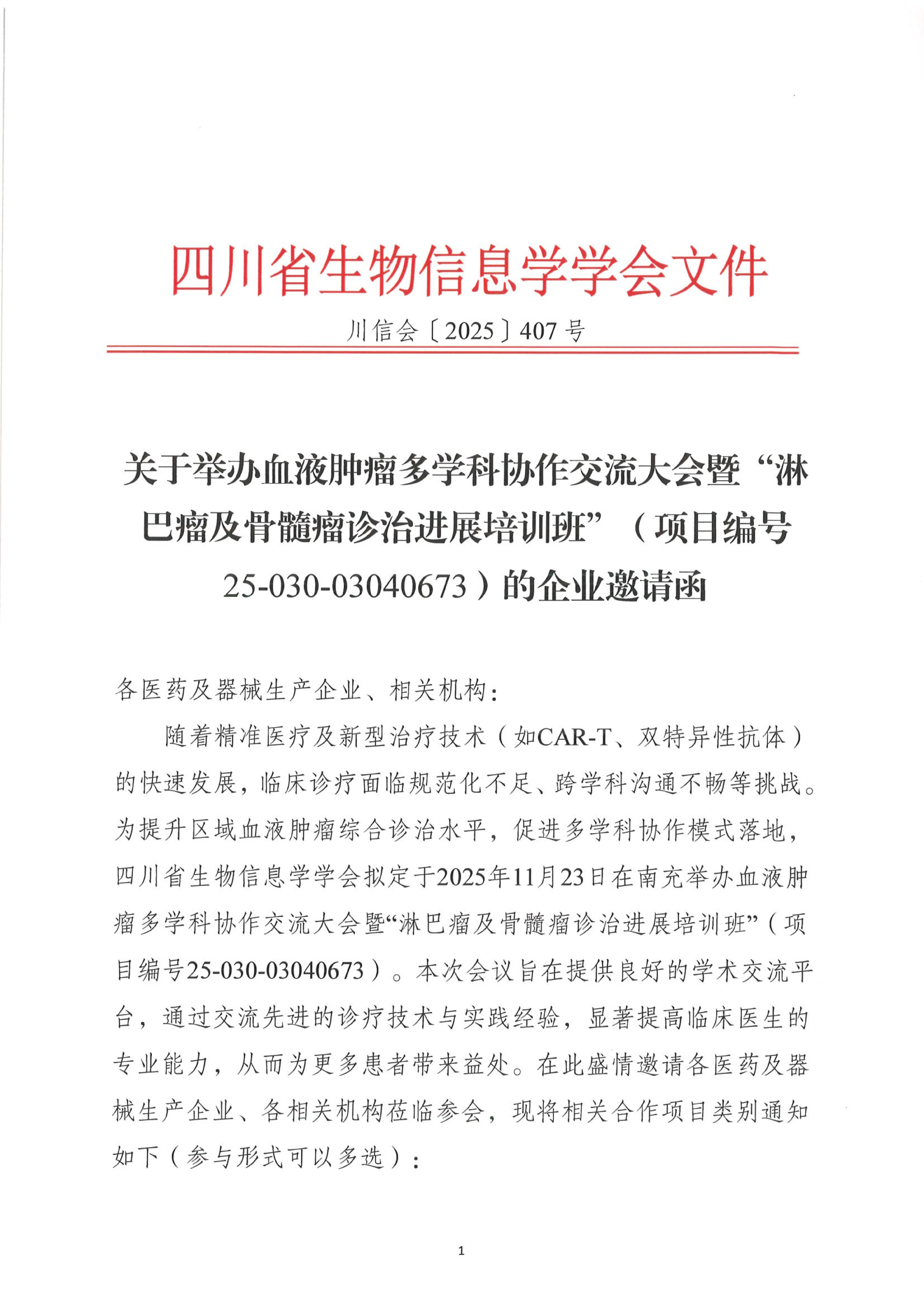 【企业邀请】关于举办血液肿瘤多学科协作交流大会暨“淋巴瘤及骨髓瘤诊治进展培训班”(项目编号25-030-03040673)的企业邀请函